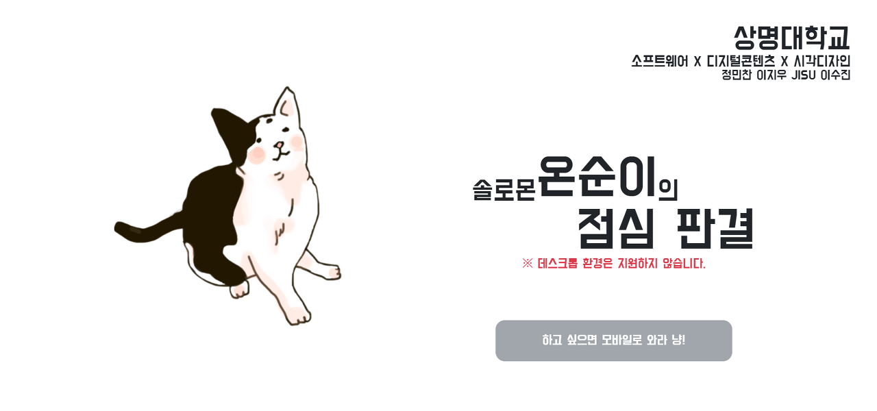 최종적으로 현재 재학 중인 상명대의 마스코트 고양이인 온순이를 판사 컨셉으로 하여 학교 근처의 음식점을 판결해 주는 서비스를 개발하기로 결정하였다.
