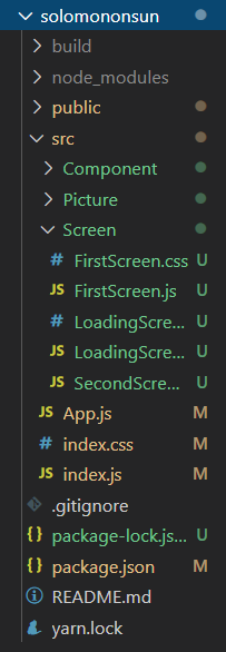 디렉토리 구조는 크게 세 갈래로, 재사용 할 수 있는 컴포넌트들을 분리해 놓은 폴더와 음식 이미지들을 모아놓은 폴더, 화면을 구성할 컴포넌트들을 만들어놓은 폴더로 구성했다.