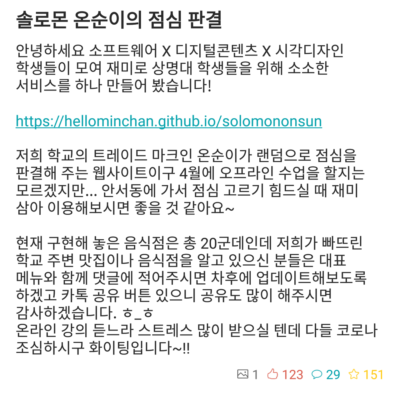 프로젝트 완료 후, 에브리타임에 서비스 홍보 글을 작성하였고,