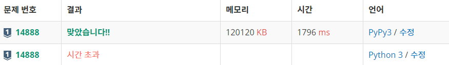 또한, Python 3로는 시간 초과가 발생하였으며, PyPy3로 정답 처리가 되었습니다. 아무래도 최댓값과 최솟값의 한도가 -10억 ~ 10억이다 보니 Python3로는 버티지 못하는 것 같습니다.
