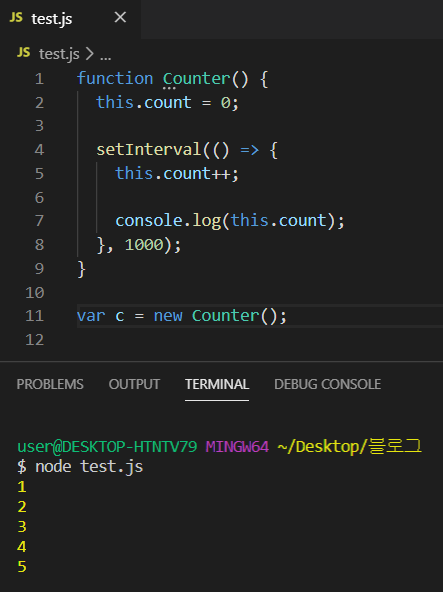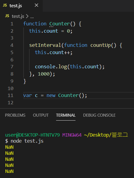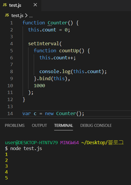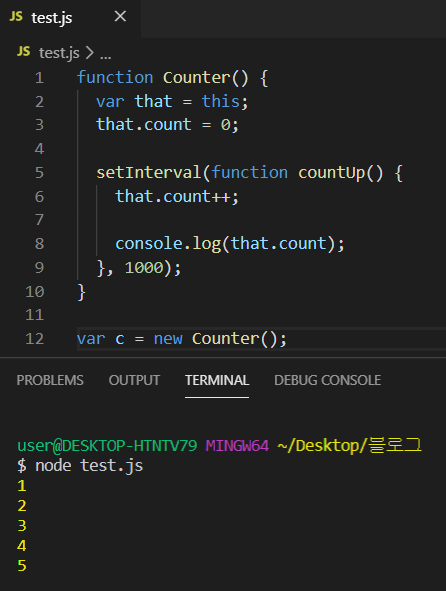 (countUp() 함수가 function 키워드로 작성되어 Counter의 this.count와 호환되지 않습니다.)