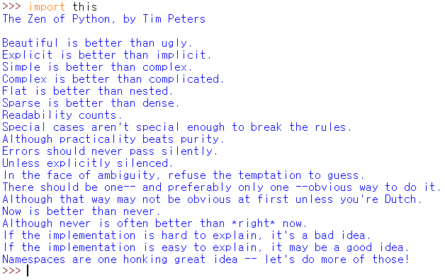 위의 이스터에그는 파이썬의 철학을 명시한 것으로, 그 내용을 조금 살펴보면