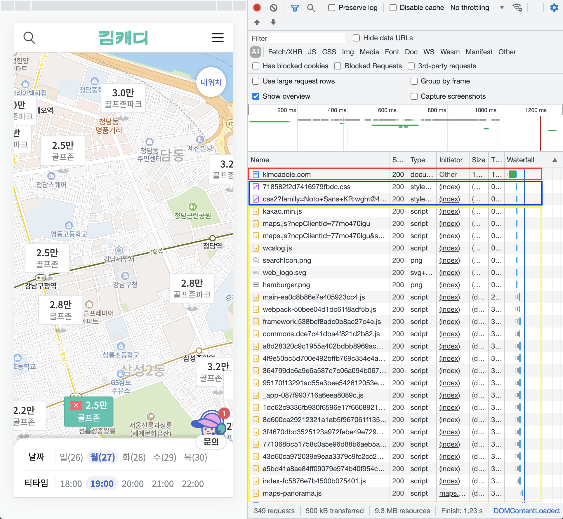 두 번째, 파란 박스를 보면 CSS 파일이 받아졌고,
