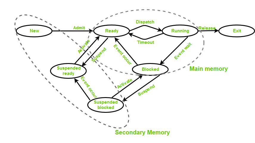 - Suspended (stopped) : 외부 이유로 프로세스의 수행이 정지된 상태 ex) 리눅스의 ctrl + z