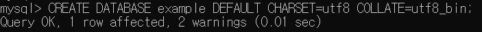 CREATE DATABASE example(데이터베이스 이름) DEFAULT CHARSET=utf8 COLLATE=utf8_bin;