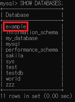 * 실행 결과 (방금 생성한 example 데이터베이스가 조회 목록에 보입니다.)