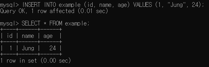 INSERT INTO example (id, name, age) VALUES (1, "Jung", 24);